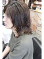 前回のパーマをいかしたカットデザイン。あまりかっちりしすぎない、そして毛先を薄くしないカットデザインが特徴。カラーは根元がプリンにならないように熊手のようなツールを使いランダムカラーに仕上げています。