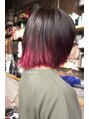 毛先に向かってブリーチを1回した後にディレクションのピンクレッド系をのせています。