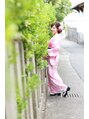 お客様自身の浴衣での撮影。ヘアアレンジは定番人気の編み込みダウンアレンジ。シンプルなトップのボリュームと艶を重視してアレンジしました。遠近感のある撮影スタイルが京都の町並みみたいに思えます。