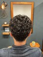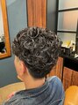 強めの前下がりパーマが、顔まわりに立体感とインパクトを与えます。サイドを潔く刈り上げることで、ボリューム感があっても清潔感は抜群。ジェルやグリースでウェットに仕上げれば、都会的でワイルドな魅力を引き出せます。