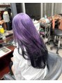 前回のホワイト系の色落ちから、リタッチでベースを整えてバイオレットにカラー。その後、同色に染めたバージンレミーエクステを80枚装着し、毛先は黒のグラデーションでコントラストを加えました。仕上げにレイヤーカットを入れて、軽さと動きをプラス◎