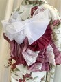 お客様の雰囲気に合わせてヘアも帯もふわふわガーリーに◎兵児帯でサイドにリボンと2段プリーツを結った後、チュールを重ねてどこから見てもボリューミーになるようにしました。サイドシニヨンは襟足が見えてくれるので下めアップでもすっきりした印象に♪