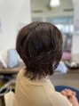 ショートレイヤースタイルです。少しウルフっぽく襟足を残し気味にしてパーマをかけています。毛量の多い方、額が狭い方におすすめです。