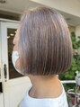 ダッセルボブ。毛先に厚みをつくる事でまとまりのあるスタイルにグレイヘアーをいかして…ブリーチなしカラーで。グレイヘアーを染める事なく…明るめのニュアンスカラーで…グレイを程よくぼかしての、新鮮なカラーに。