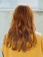 ぱっつんバングにオレンジ系カラーのオルチャン風ヘアです。ハイトーンのオレンジ系カラーにすることでツヤ感がでやすくなります。重ためのカットベースに波ウェーブで仕上げることによりティーンズ・ガーリーな雰囲気をだします。【橋本/東橋本/TOKIO】