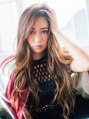 毛先軽めのロングレイヤースタイル。大きめにくせ毛風のカールをつけてスタイリングをしています。かきあげバングと全体のドライな質感がカジュアルで決めすぎないラフな印象をあたえてくれます。カラーリングはハイライトを全体に入れて立体感が出るように
