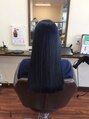 ブルーブラックでツヤツヤロング、今回はブリーチをして染めました、ご希望であまりブルー寄りにはしていません、色の抜け感も楽しいですよ