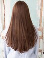 胸下のスーパーロングヘアー!前上がりに切ってワンレンできることにより、柔らかいAラインシルエットに!ワイドバングにすることにより、ロングとのバランスがとれます。カラーは透明感あるハニーブラウンにし重たく見えないようにしました。