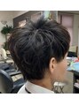 メンズカットです。えり足はすっきりスーツの襟にかからないようにカットしました。トップは動きが出るようにカットし、スタイリング次第で色んなスタイルを楽しめるようになっています。