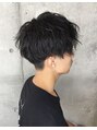 マッシュベースのショートスタイルに、ツイストパーマで無造作な動きをつけたスタイルです。[表参道/青山/表参道駅]
