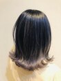 肩ほどにワンレングスで切った髪を質感調整をして毛先に動きが出る軽い仕上がり。ブリーチは過去の履歴を含め2回程。根元から中間までは濃いネイビーで。毛先はパープルアッシュのグラデーションに。色が抜けてくる頃合いでホワイト系になります。