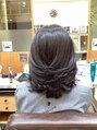 肩に少しつくレングスから全体にレイヤーの入った前上がりのミディアムレイヤースタイルです。カラーはダークブラウンです。ナチュラルドライでOKです。コテで巻き髪にするとエレガントになって素敵ですよ!