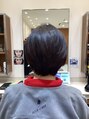 襟足を甘く残し、あまりショートになり過ぎず、落ち着いた感じのグラデーションボブスタイルです。首や顔周りをすっきりし過ぎたくない方にはお勧めです!カラーはダークブラウンです。
