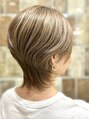 センターパートで分けた前髪に、襟足は長めに設定してあるウルフカットベースのショートヘアです。後頭部の丸みは残しながら、かっこいいイメージを保つためにやや縦長の印象になっております。ハイトーンで、より大人女性の魅力にあふれたヘアスタイルです。