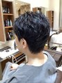 サイドのアンダーセクションはすっきり刈り上げてバックは甘く残したはち上だけパーマをかけたツーセクションのメンズパーマスタイルです。ナチュラルドライでOKです。パートの位置を変えたり、パートなしの放射状に乾かしても良いですね!