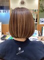 襟足ぎりぎりの真っ直ぐなワンレングスボブスタイルです。上を向いても下を向いても綺麗なラインでいられます。カラーはブラウンベースにハイライトを入れる事で躍動感が出ます。ナチュラルドライでOKです。