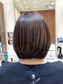 襟足ぎりぎりのレングスでやや前下がりのグラデーションボブスタイルです。ワンレングスより丸みがあるので綺麗に内巻きになりやすいです。カラーはベージュブラウンです。ナチュラルドライでOKです。