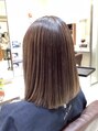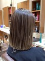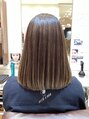 肩に付くワンレングスのストレートスタイルです。カラーはハイライトをブラウンベースに入れる事で軽やかで動きが出ます。ナチュラルドライでOKです。