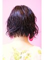 ラウンドボブのウェットパーマスタイル前髪長めの斜めバング。ボリュームが出やすい方にオススメスタイル。スタイリング剤は、セット力の弱いジェルがおすすめです。