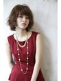 ラウンドボブのパーマふんわりスタイル。内巻きボブに飽きて大人っぽく変身したい方にオススメです。厚めバングで斜めに流した前髪に髪色は艶のあるベージュ系で柔らかさを出しました。