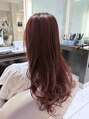 アディクシーカラーのボルドールビー×スモーキーアンバーでつくる、深みのある赤系ロング。光が当たると柔らかく透けて、重く見えない上品なツヤを表現。なめらかなストレート仕上げで、髪そのものの美しさを引き立てます。