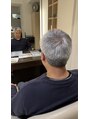 全体はスッキリと短めに整え、襟足とサイドはタイトに収めることで清潔感のある印象に。トップには程よい長さを残し、丸みと立体感が出るようにカットしています。白髪特有の硬さや広がりを感じさせないよう、毛流れを意識して仕上げているのがポイントです。