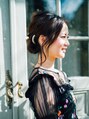 顔周りに少し多めにおくれ毛を残したルーズなアップスタイル。 バックは表編みにして下方で毛先をしまいこむようにロール状にまとめています。正面からがルーズな分、バックはすっきり綺麗にまとめるとバランスが良いです♪