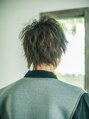 襟足は角を残してカットし全体的に少し長さを残したショートレイヤーに。毛量を程よく調整し無造作な動きと程よい束感をプラス!全体的にクセづけ程度パーマをランダムにオン!スタイリングがカッコ良く決まる好感度の高いスタイル☆