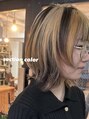 顔まわりにレイヤーを効かせたミディアムボブ。ハイトーンベージュにダークトーンを差し込んだデザインカラーで、動きと立体感を演出。軽さと個性を両立した大人カジュアルなスタイル。