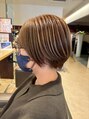丸みのあるショートボブに細めのハイライトを入れることで、自然な立体感と動きをプラス。白髪をぼかしながら明るさを楽しめるデザインに仕上げています。襟足はすっきり収まるようにカットし、横から見ても美しいシルエットに。