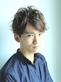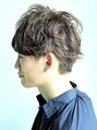 前髪を長めに残したショートレイヤーに毛先がハネるようなピンパーマをかけて無造作な動きをつけたスタイルです。トップは根元が立ち上がるようにボディパーマをかけ、毛先はピンパーマで外ハネになるように巻いています。