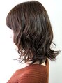 コールドパーマで動きをつけた無造作なミディアムレングスのウェーブスタイルです。すべておなじ方向に巻いてパーマをかけているので、ドライヤーでねじりながら乾かしてスタイリングしても良しムースをつけて放置しておいても良いスタイルとなっています。