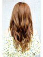 レイヤーをいれ、カールアイロンで動きを強めにつけたロングスタイルです。毛先と中間を38mmで巻いて束が重ならないようにして動きをだしています。前髪は斜めに流れるようにスライドカットを用いて切り、カラーは明るい印象を与えるオレンジアッシュ。
