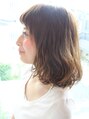 ミディアムのウエーブスタイルです。前髪は眉上に設定してカットで丸さをつくり、コールドウエーブで毛先中心に遊びをつくり立体感をだしています。