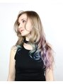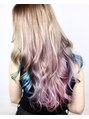 プラチナブロンドに春色カラー。ターコイズ、ブルー、バイオレット、パープル、ピンクの順に毛先をカラーリングしたグラデーションカラー。