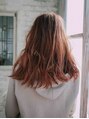ミディアムレングスのゆるふわウェーブ!毛先にゆるくウェーブを出しているのでAラインのミディアムですが全体的に軽い印象になります!バングは流しているので顔まわりがすっきりするので明るくなります!ヘアカラーのオレンジベージュでキュートに!!