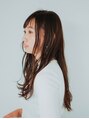 ゆるく波になるように巻いたニュアンスウェーブです。毛先を全部外はねにすることで全体に立体感をプラスさせています。バングは眉の高さでゆるくまいてガーリー感をだしています。