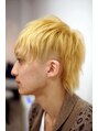 サイドを刈り込んだレイヤースタイル。大胆にセニングを入れて毛束感を強調。カラ-はブリーチでぺールイエローまでトーンアップ。