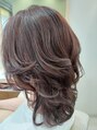 クァンタムカラー(前処理トリートメント)色味はアメジストカラーで根元はグレーカラーです。柔らかみがあります。ウルフレイヤーで、仕上げにカールアイロンで巻いています。