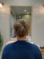 トップが立ち上がりやすく、ベリーショートにしています。こめかみまで刈り上げ、ツーブロック。カラーは、ダブルブリーチしてからオンかカラー13トーンスモーキートパーズ。