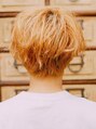 ネープギリギリのスッキリしたショートに、上からかぶせるように少し重ためのボリュームでカットしました!全体的にパーマでゆるくふんわりかけてから、カラーは14トーンのブラウンにオレンジを足して、暖かみのあるカラーにしました!