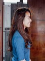 胸下でカットしたロングスタイル。重たい印象になりがちなバングが長いロングスタイルも顔まわりを少し軽くして肌を透けさせることで顔が明るくなります。スタイリングは太めのコテで耳から下だけどをゆるく巻いています。
