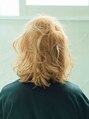 鎖骨あたりで切りそろえたワンレングスのミディアムボブ。スタイリングは太めのコテでリッジ強めに巻いてクールな雰囲気に。まろやかなベージュ系のハイトーンカラーと毛先は内巻きにすることで柔らかさをプラスしています。