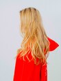 ブリーチのダブルカラー。根元は伸びてきてもくっきりと色が分かれないようにナチュラルに見えるようにカラーをします。バングはサイドパートで分けてかきあげ風にも見せられます。大きめのコテで巻くのがスタイリングのコツです!!