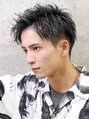ツーブロックと刈り上げの入ったスッキリしたアップバングショートです!ナチュラルなパーマでランダムでシャープな動きがカッコいいスタイルです!ウエットな質感で男らしさと、爽やかさを演出します!
