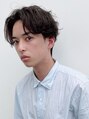 センターパートで2ブロックスタイルです。インナーサイドと襟足は刈り上げ。サイドは耳に少しかかる長さに設定。パーマは、ランダムに中間巻きしてクセ毛風にしています。