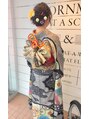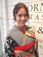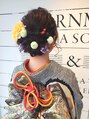 ヘアカラーはツヤの出るアッシュベージュに、前から見てもおくれ毛と飾りのバランスがカワイイ スタイルに仕上げました。飾りは生花を♪着付けは着崩れがないようにしっかりと。でも、長く着ていても苦しくならないように工夫しています。