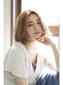 肩上レングスの重ため切りっぱなしボブ。明るめのヌーディーベージュのカラーで重たく見えさせすぎないのがポイント。作りこみすぎないシンプルボブが誰からも愛される好印象ヘアに◎