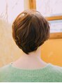 トップが長めのショートボブです。万能ショートボブです!!カラーは落ち着いたブラウンカラーに細くハイライトが入っています。パーマをかけるとスタイリングが楽になりますよ!