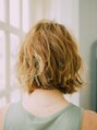 ワンレングスのボブがベースのスタイル。表面をメインに大きめのウェーブがでるようにパーマをかけています。クシャッとしたくせ毛風のデザインでラフな印象!ざっくり分け目をぼかしたセンターパートでオシャレに!